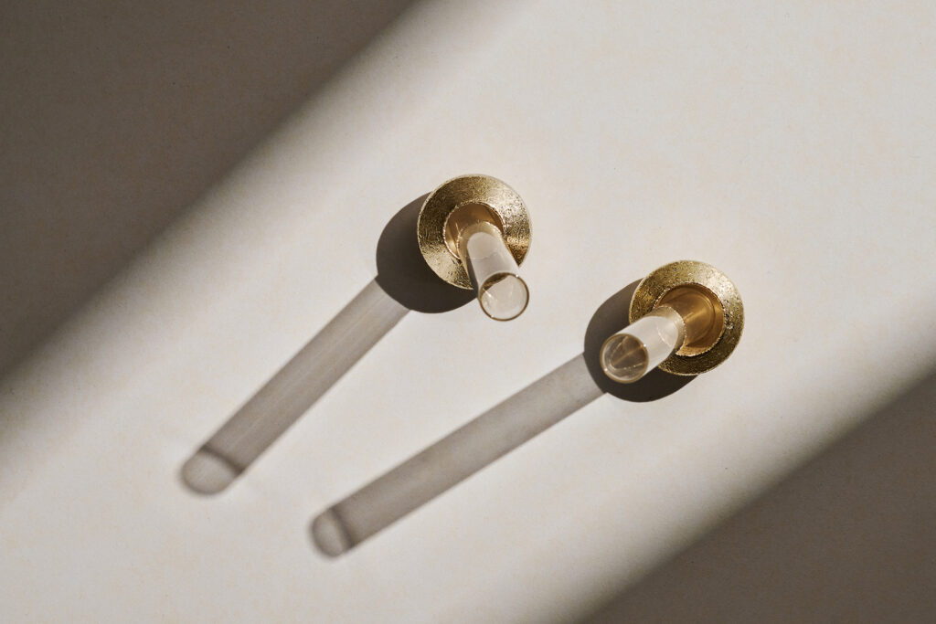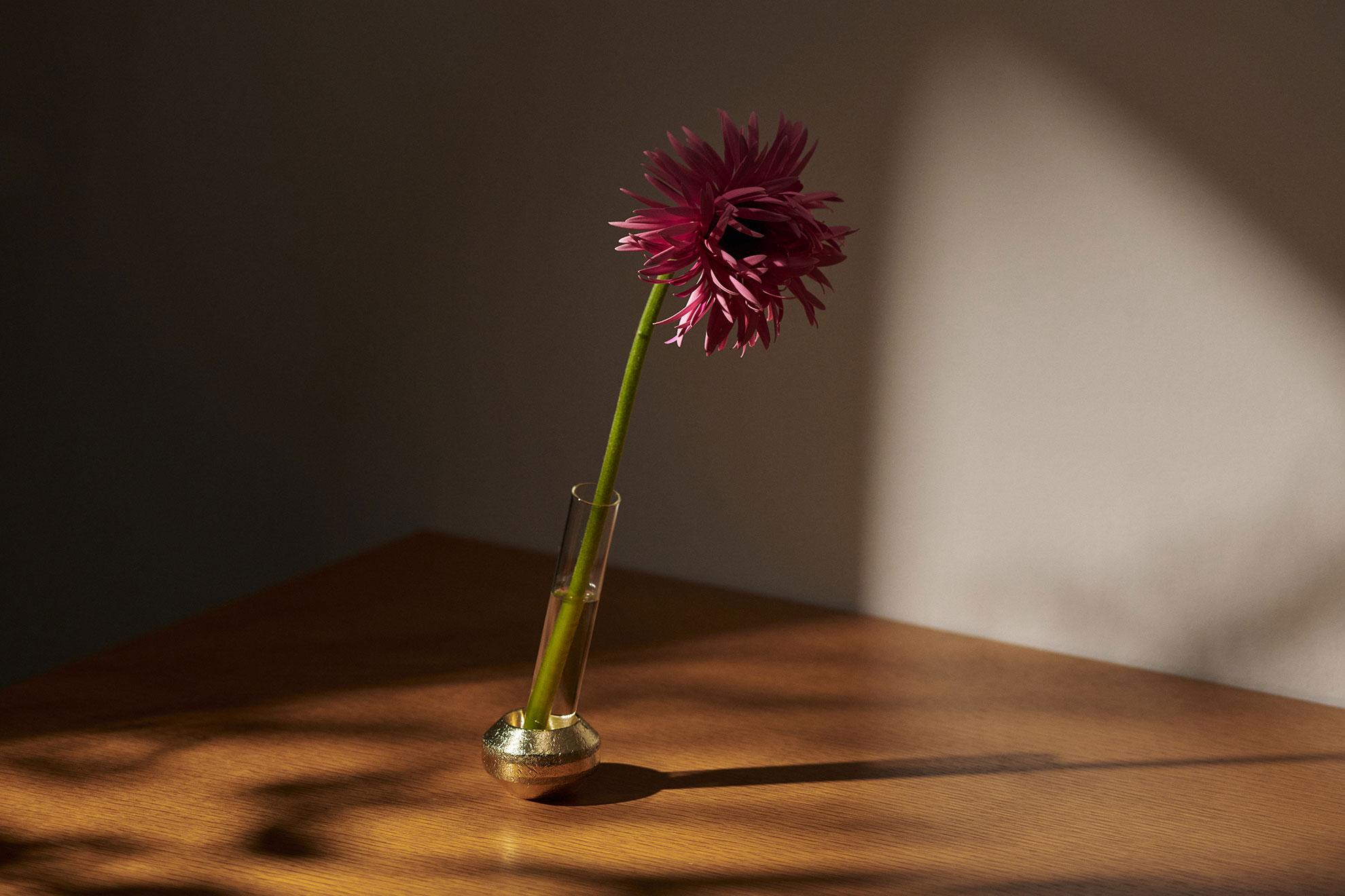 a/sym(アシム)は、真鍮製の台座とガラス管を組み合わせた花器です。 ガラス管を垂直に立てればシンメトリーな佇まいに、台座にそっと持たせかけることでアシンメトリーな表情へと変化します。置き方ひとつで異なる印象を生み、さまざまなアレンジをお楽しみいただけます。 真鍮鋳物製の台座には、あえて製造過程で生まれる跡を残す仕上げを施しました。時間の経過や使用とともに色合いや風合いが変化していく真鍮という素材の特性や、ものづくりの痕跡も、この製品ならではの表情としてお楽しみいただけます。なお、経年変化を味わっていただくため、クリア塗装などの表面コーティングは施していません。